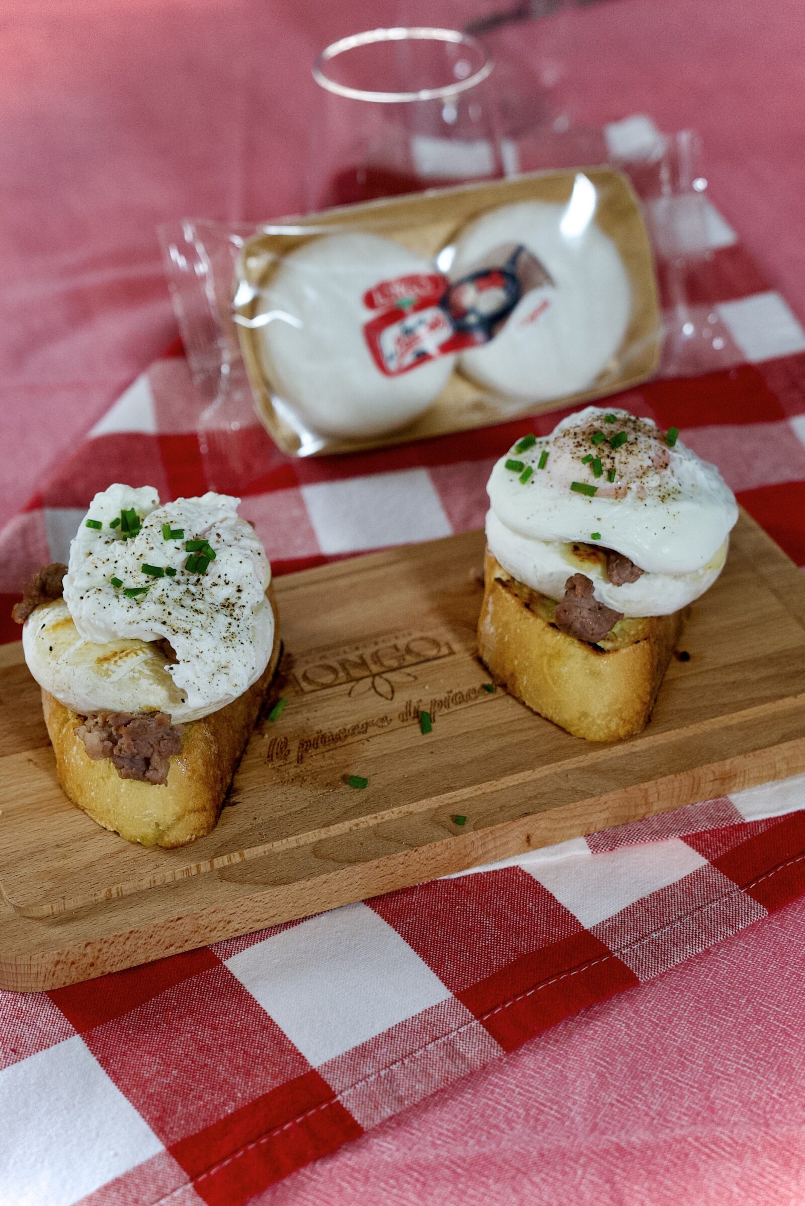 5.Assemblaggio: Su ogni fetta di pane adagia il tomino fuso, poi l’uovo in camicia e infine il crumble di salsiccia.